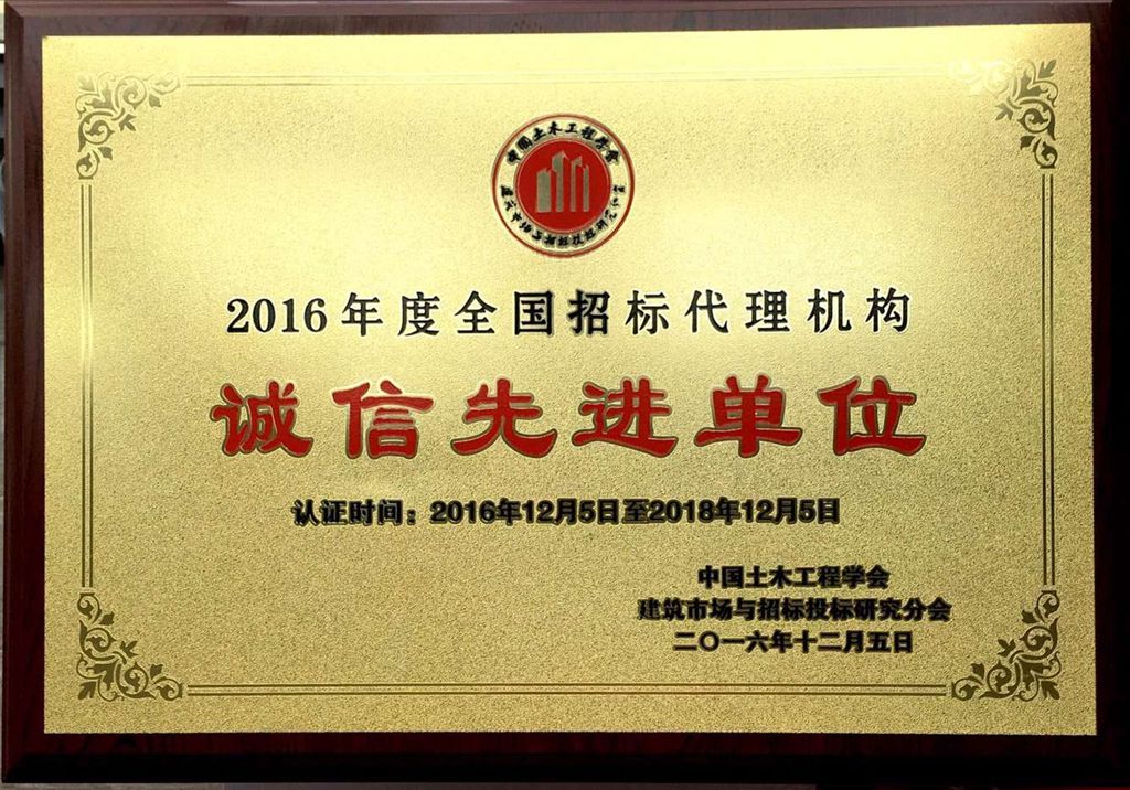 獲得2016年度全國(guó)招標(biāo)代理機(jī)構(gòu)誠(chéng)信先進(jìn)單位稱號(hào)